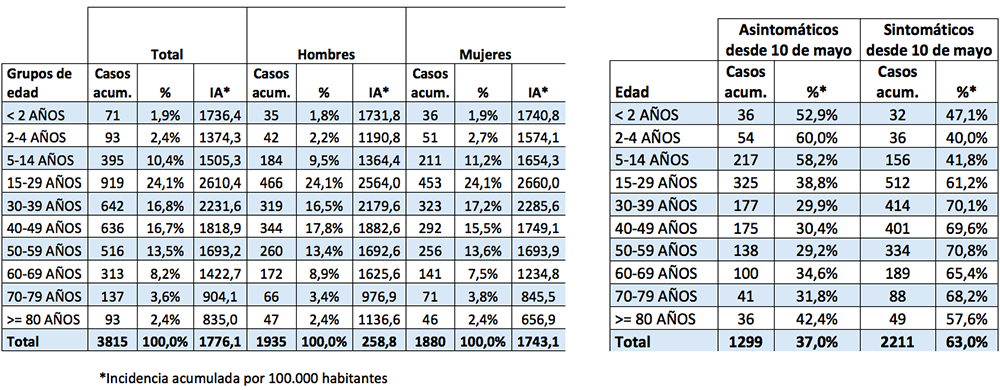 En cuanto a los afectados por grupos de edades, destacar que la franja que ab arca de 15 a 29 años es la más numerosa con 9191, muy superior al resto y estando bastante pareja la cifra entre chicos y chicas. También es el grupo que más asintomáticos registra con 325.