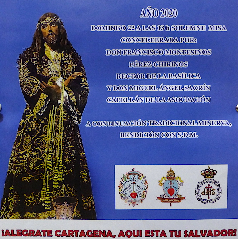 La Real Basílica Menor de la patrona de Cartagena acoge este domingo, a las 13 horas, una solemne eucaristía que será concelebrada por los sacerdotes Francisco Montesinos, rector de la basílica, y Miguel Ángel Saorín, capellán de la asociación canónica del Cristo de la Divina Misericordia.