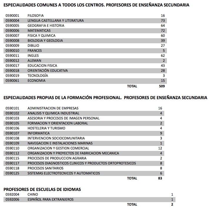 Para profesores de Enseñanza Secundaria. Especialidades comunes a todos los centros (509): Filosofía (16), Lengua Castellana y Literatura (73), Geografía e Historia (64), Matemáticas (72), Física y Química (60), Biología y Geología (39), Dibujo (27), Francés (5), Inglés (62), Alemán (2), Educación Física (43), Orientación Educativa (28), Tecnología (3) y Economía (15).