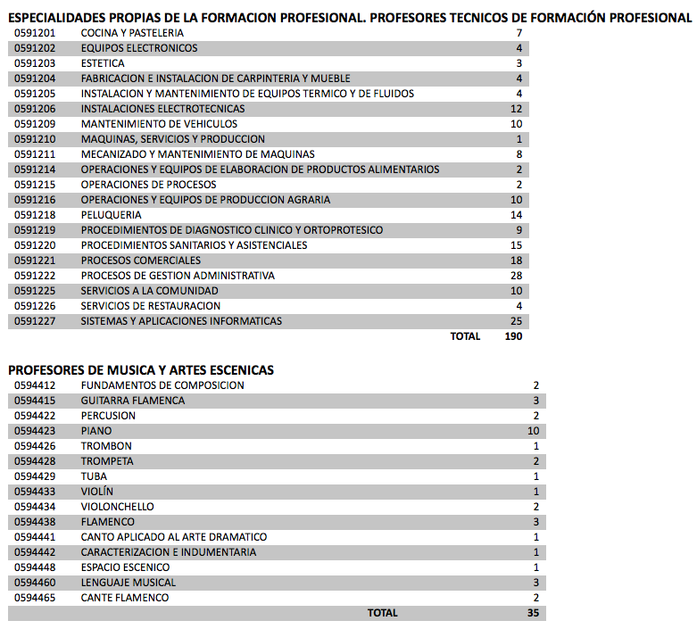 Para profesores de Enseñanza Secundaria. Especialidades propias de la formación profesional (83): Administración de Empresas (16), Análisis y Química Industrial (4), Asesoría y Procesos de Imagen Personal (4), Formación y Orientación Laboral (2), Hostelería y Turismo (4), Informática (9), Intervención Sociocomunitaria (3), Navegación e Instalaciones Marinas (1), Organización y Gestión Comercial (12), Organización y Proyectos de Fabricación Mecánica (4), Procesos de Producción Agraria (2), Procesos Diagnósticos Clínicos y Productos Ortoprotésicos (8), Procesos Sanitarios (8) y Sistemas Electrotécnicos y Automáticos (6).