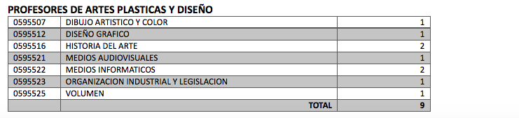 Para profesores de Artes Plásticas y Diseño (9): Dibujo Artístico y Color (1), Diseño Gráfico (1), Historia del Arte (2), Medios Audiovisuales (1), Medios Informáticos (2), Organización Industrial y Legislación (1) y Volumen (1).* Texto remitido en el que se respeta el contenido íntegro, la redacción y la ortografía, con excepción del titular y de la entradilla del artículo