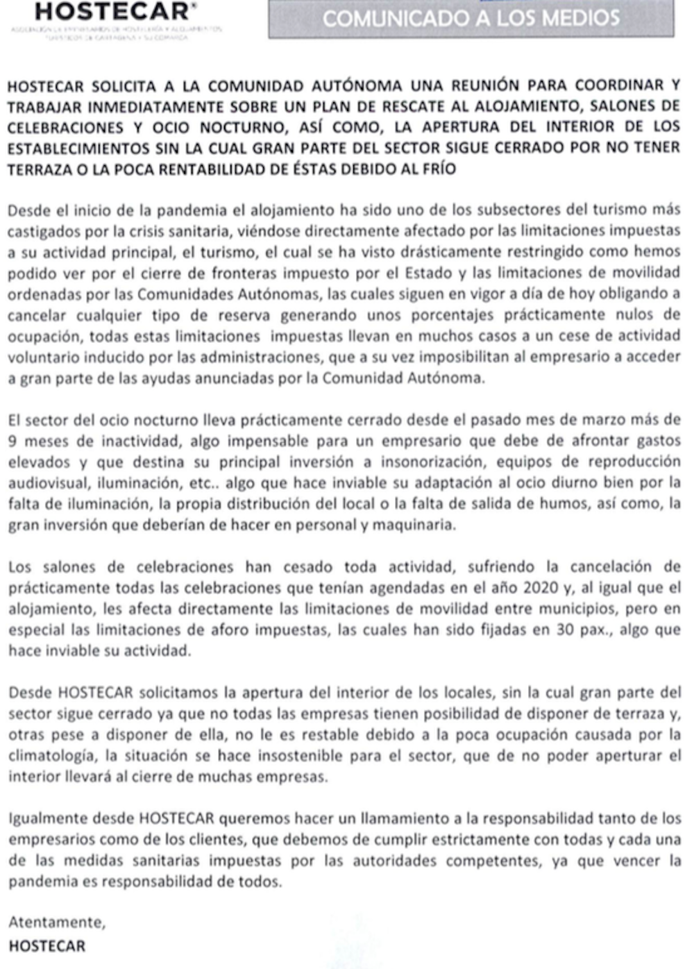 Reclaman un plan de rescate para negocios de alojamiento, celebraciones y ocio nocturno