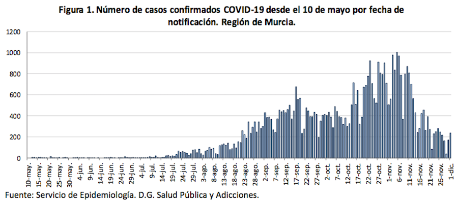 De los 237 nuevos casos, 46 corresponden al municipio de Murcia, 23 a Cartagena, 21 a Torre Pacheco, 17 a Lorca, 18 a Los Alcázares, 12 a Mazarrón, 11 a Yecla, 10 a Águilas, 8 a Puerto Lumbreras, 7 Alhama de Murcia, 7 a Archena, 7 a San Javier, 6 a Caravaca de la Cruz, 6 a Cieza y Jumilla. El resto están repartidos entre diversas localidades.