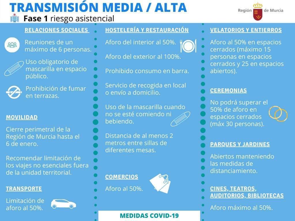 Atendiendo la petición de bastantes lectores, un poco confusos con las restricciones que se ordenan y que después se levantan, ofrecemos un cuadro resumido sobre los límites actuales y las prohibiciones de la Comunidad Autónoma en cuanto a reuniones, movilidad, hostelería, velatorios, ceremonias, parques, cines, teatros, bibliotecas, etc., dentro de la Fase 1 de riesgo de transmisión medio alto que tiene nuestra zona. Añadimos variaciones para determinadas fechas de las normas estatales.