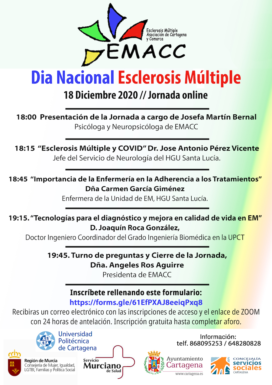 Reconocidos profesionales del Servicio Murciano de Salud, (neurólogo y enfermera de la Unidad de EM del HGU de Santa Lucía) y la Universidad Politécnica de Cartagena nos hablarán de Esclerosis Múltiple, COVID, Importancia de la enfermería en la adherencia a los tratamientos y las aplicaciones tecnológicas para el diagnóstico y la mejora de la calidad de vida. Un evento sobre salud, asistencia a la enfermedad, tecnología y esperanza, dirigido a personas con Esclerosis Múltiple y otras enfermedades afines, familiares, profesionales sanitarios, personal docente y estudiantes de la UPCT y profesionales de la atención social a personas con enfermedades neurodegenerativas y autoinmunes.