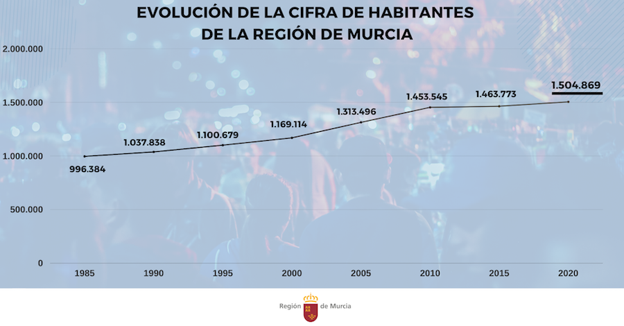 La Región de Murcia ha superado por primera vez el millón y medio de habitantes, según reflejan los datos de población por comunidades autónomas publicados por el Instituto Nacional de Estadística (INE) y que toman como referencia el 1 de enero del presente año. Así, se ha pasado de los 1.495.084 habitantes registrados el 1 de julio de 2019 a los 1.504.869 a primer día de 2020, es decir, 9.785 más en seis meses.