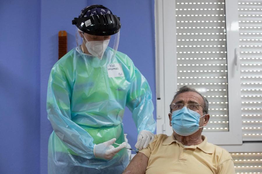 Josefa, 83 años de edad e interna en la residencia Mensajeros de La Paz de San Pedro del Pinatar, ha sido la primera vacunada frente al COVID-19. Manuel, interno en la residencia de Mensajeros de La Paz, ha sido el segundo. Sonia y Jesús son los enfermeros del equipo Covid del 061 que las han aplicado.