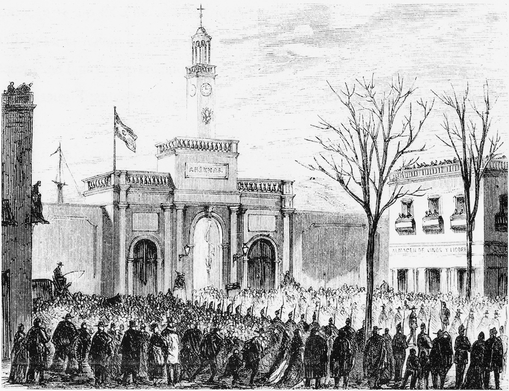 A las dos de la tarde, en una falúa blanca y dorada se aproximaba al puerto. Visitó el arsenal y la fragata ‘Arapiles’. A pie, y sin escolta, entre una muchedumbre silenciosa que le miraba con curiosidad y le observaba con fijeza se dirigió a visitar el Hospital de Caridad. Allí se oyeron algunos ‘vivas’ que gritaban los enfermos al verle aparecer.