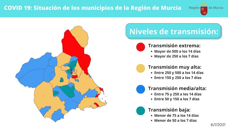 De los 765 nuevos casos, 256 corresponden al municipio de Murcia, 103 a Cartagena, 40 a Lorca, 40 a Molina de Segura, 25 a La Unión, 21 a Fortuna, 21 a Jumilla, 20 a Los Alcázares, 20 a Torre Pacheco, 18 a Cieza, 15 a Abanilla, 15 a Caravaca de la Cruz, 15 a San Javier, 15 a San Pedro del Pinatar, 15 a Santomera, 15 a Yecla, 12 a Las Torres de Cotillas, 11 a Mula, 10 a Moratalla, 9 a Totana, 8 a Águilas, 7 a Alcantarilla, 6 a Mazarrón, 5 a Blanca, 5 a Bullas, y 5 a Ceutí. El resto están repartidos entre diversas localidades.