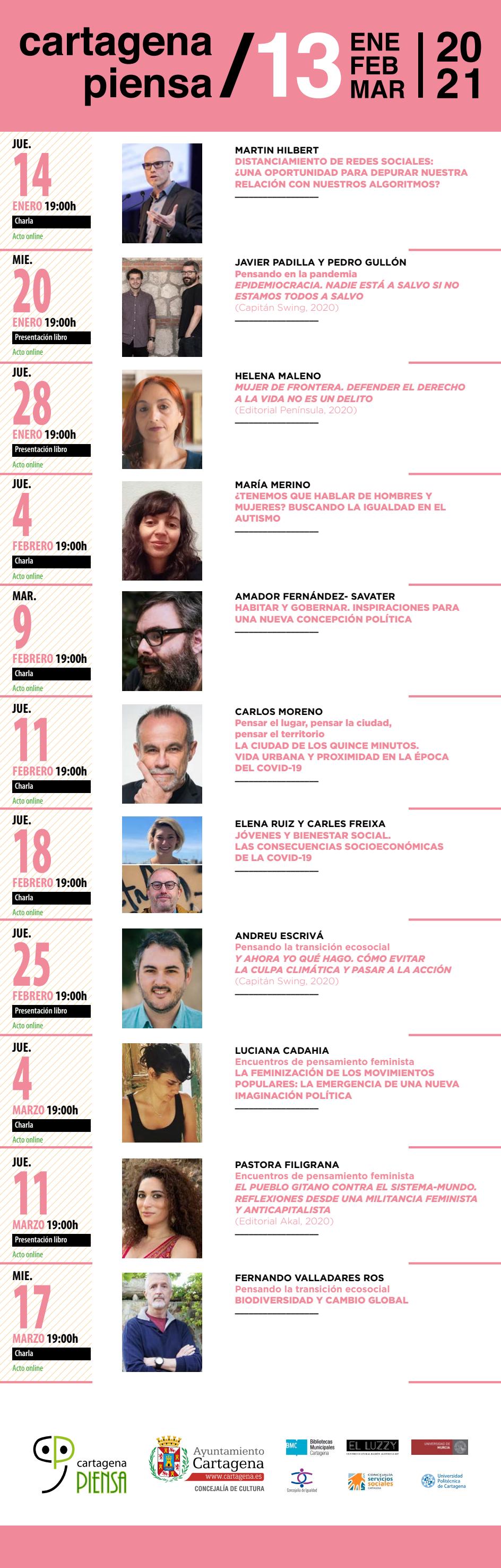 Los médicos Javier Padilla y Pedro Gullón hablarán de su libro, recientemente publicado, "Epidemiocracia. Nadie está salvo si no estamos todos a salvo". En temas de transformaciones sociales, el pensador y ensayista Amador Fernández-Savater hablará sobre el 15-M, uno de los fenómenos sociales y políticos más relevantes de los últimos tiempos que este año cumple su décimo aniversario. Para cerrar esta 13ª edición de Cartagena Piensa, el arquitecto Victor Fernández Pacheco, de la UPCT dará la nota local en el programa y en cuya presentación hablará de "la impresión 3D como cambio de modelo de producción y consumo".