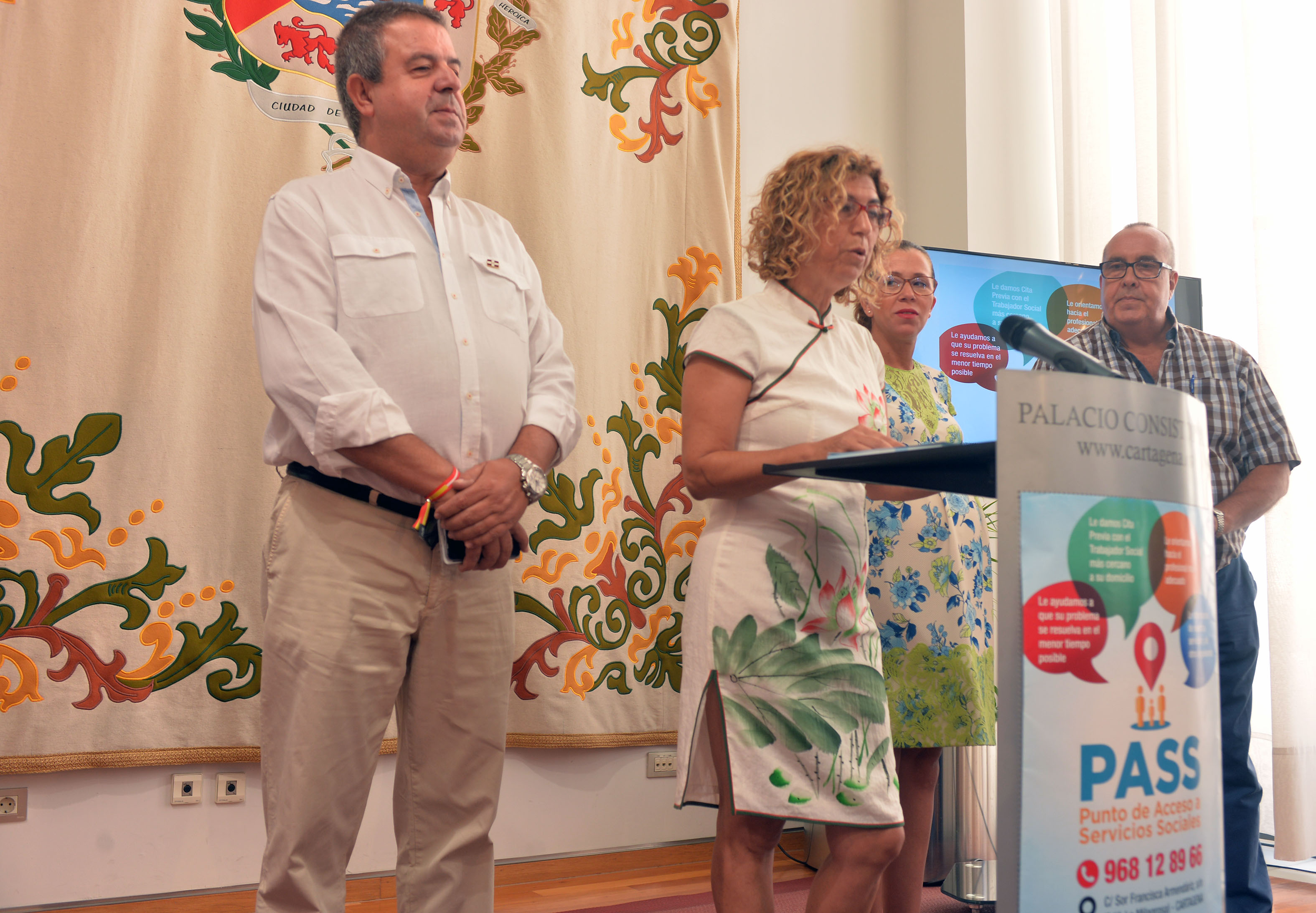 La alcaldesa de Cartagena, Ana Belén Castejón, ha presentado el Punto de Acceso de los Servicios Sociales (PASS). Una oficina de atención al público que permitirá la resolución inmediata de gestiones y dudas de los ciudadanos, y que ha supuesto la reducción del tiempo de espera para las citas con la Unidad de Trabajo Social (UTS) de cinco semanas a un máximo de una semana. Junto a la alcaldesa han comparecido el concejal del Área de Calidad de Vida, Francisco Calderón, y la concejala de Servicios Sociales, Carmén Martín del Amor.