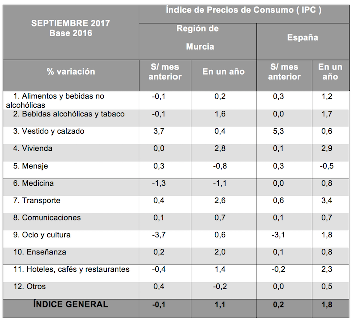 Según los datos publicados hoy por el Instituto Nacional de Estadística (INE), el IPC, en tasa interanual en la Región de Murcia, se incrementa una décima, situándose en el 1,1%, cifra que a su vez se encuentra siete décimas por debajo de la estatal. Respecto al mes pasado, el IPC disminuyó una décima.