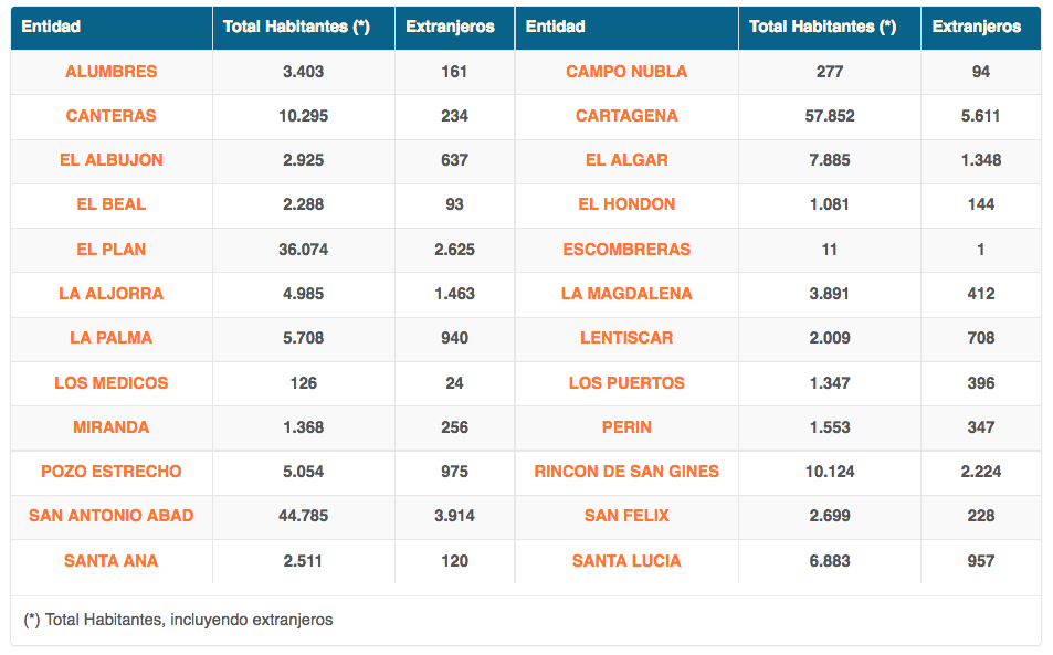 Otro aspectos a destacar es el movimiento en núcleos de población. Sigue bajando la cifra de residentes en el casco antiguo (hasta el paseo de Alfonso XIII). Este año ha bajado en 655 residenteal pasar de 44.509 a 43.854. El casi ochenta por ciento restante de la población está en barrios y diputaciones. Ahí hay una ligera bajada en la mayoría, con excepción de ocho, destacando el incremento en la diputación de El Plan (barrios de Cartagena Norte más barriada Cuatro Santos y La Guía) de 232 vecinos más, situándose en 36.074 residentes. Los restantes incrementos se han dado en Pozo Estrecho (+62), Santa Lucía (+61), Alumbres (35), La Palma (32), La Aljorra (28), El Beal (14) y Santa Ana (+4).