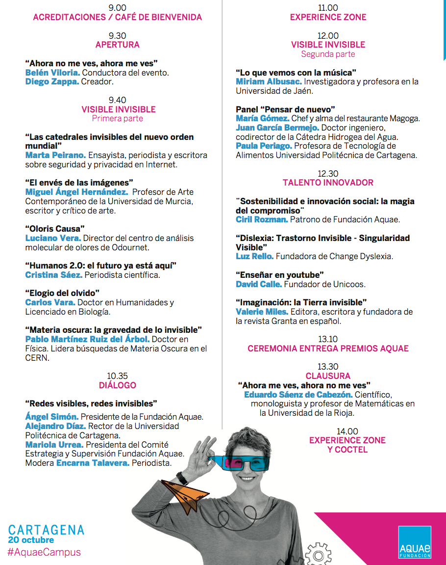 Fundación Aquae, en colaboración con Hidrogea, celebra el 20 de octubre en la Facultad de Empresa de la Universidad de Cartagena, Aquae Campus, un evento inspiracional y divulgativo en el que más de 15 ponentes de proyección internacional, entre investigadores, artistas, pensadores y emprendedores sociales, compartirán ideas y proyectos transformadores bajo el lema ‘La revolución de las ideas’. La temática de esta IV edición es ‘Visible-Invisible’.