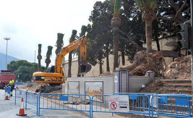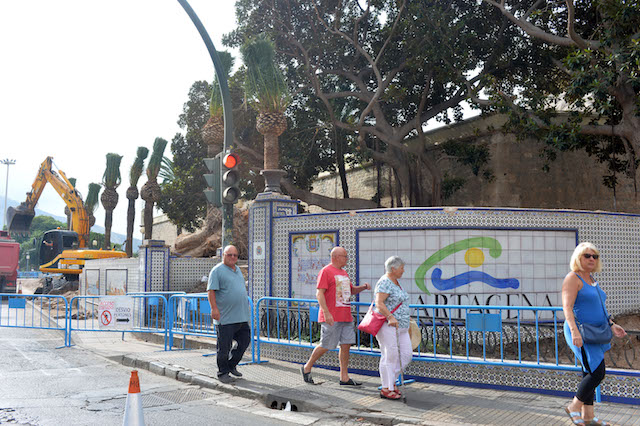 Estos días se están acometiendo trabajos en el inicio de la Cuesta del Batel, junto a la  plaza antes denominada de Bastarreche. Por un lado está la poda del arbolado y, por otro, reparar los daños que están causando las raíces. Los ciudadanos han visto cómo algunas de las escenas que representaban a Cartagena han desaparecido y están pendientes de ver si se recuperan.