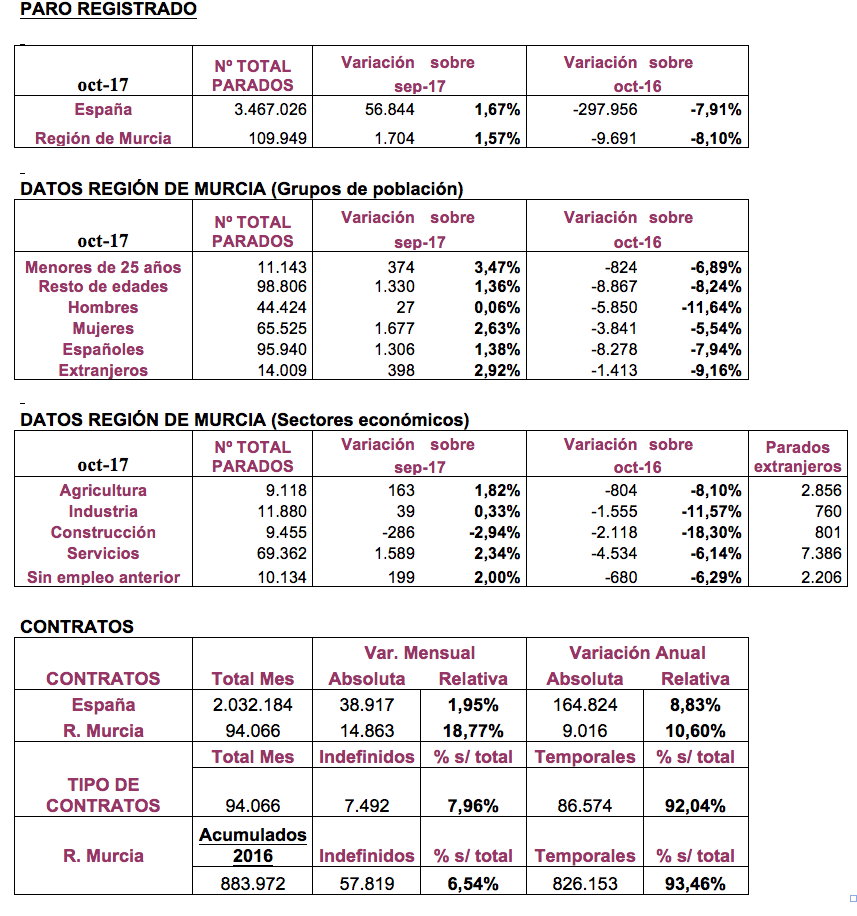 En la Región de Murcia se han producido 94.066 contratos durante el mes de octubre, 14.863 contratos más que en el mes de septiembre, lo que significa un 18´77% de incremento. De éstos, 7.492 han sido indefinidos (7´96%), mientras que los contratos temporales han sido 86.574 (92´04%). La contratación indefinida esta por debajo de la media nacional que significa el 10%.