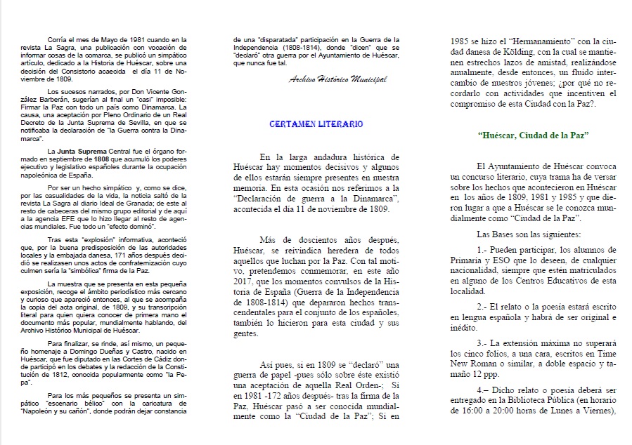 La exposición instalada en el hall del Ayuntamiento contiene documentos originales, tanto de la declaración de la guerra, artículos de prensa o el original del bando del tratado de paz firmado por Alcalde y Embajador. Además se organiza un certamen literario para alumnos de Primaria y Secundaria, sobre la paz con Dinamarca. Hecho histórico, por el que nuestra Ciudad es conocida como Ciudad de la Paz.