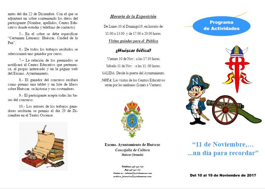 Visita la exposición y participa en las visitas guiadas por Huéscar y conoce la relación que ha tenido con los diferentes conflictos bélicos. Las visitas partirán del Ayuntamiento el viernes a las 17:30 horas y el sábado a las 11:00 horas. El alcalde y varios concejales han visitado una exposición que encierra más de 200 años de historia de Huéscar, 'La ciudad de la paz'.