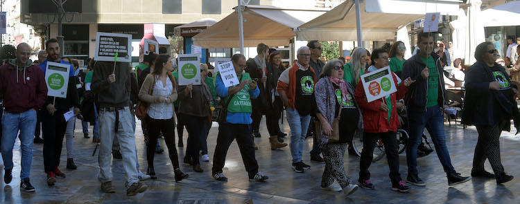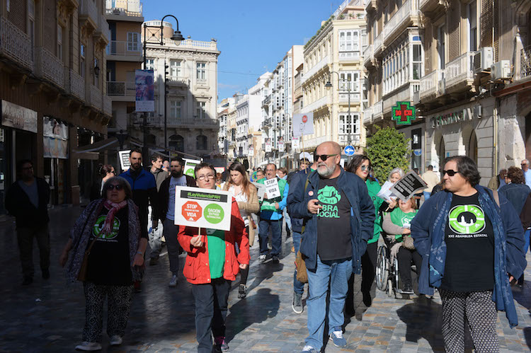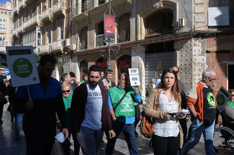 La Plataforma de Afectados por las Hipotecas de Cartagena ha protagonizado una concentración en el casco antiguo, con posterior marcha hacia oficinas bancarias para denunciar sus prácticas, dentro de una campaña estatal para reclamar una Ley de Vivienda que impida seguir pagando la hipoteca cuando el banco ya ha arrebatado la vivienda. Durante esta actuación se ha resaltado que el juzgado de primera instancia de la ciudad de Murcia habilitado en exclusiva para llevar asuntos hipotecarios en al Región de Murcia ya está desbordado de asuntos, ha indicado Diego Conesa, integrante de la PAH, quien recuerda que no se permite a los ciudadanos llevar a cabo su derecho de acudir al juzgado más cercano a su residencia.