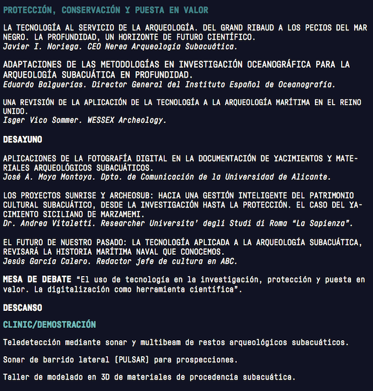 El Museo Nacional de Arqueología Submarina ha acogido en Cartagena, durante dos días, las ‘Primeras jornadas tecnoarqua’, basadas en las innovaciones tecnológicas aplicadas a la arqueología submarina, la protección del patrimonio subabcuático y el presente y futuro en este terreno. Ha contado con la participación de ponentes de empresas líderes en tecnología y oceanografía marina, universidades y representantes de las administraciones públicas.