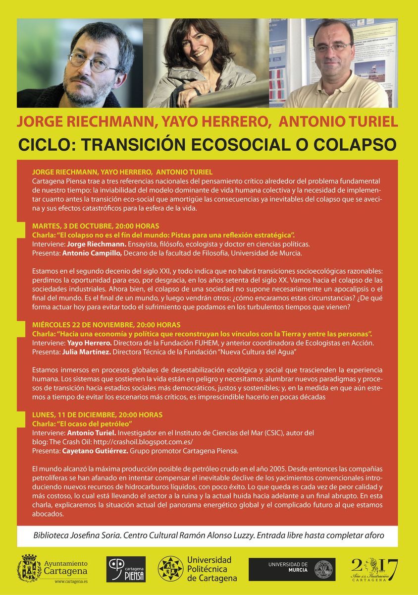 Con esta charla se cierra el ciclo "Transición ecosocial o colapso" que ha venido desarrollando el programa Cartagena Piensa en colaboración con la Concejalía de Cultura del Ayuntamiento de Cartagena, por el que han pasado, además de Antonio Turiel, el filósofo y poeta Jorge Riechmann, y la antropóloga ecofeminista Yayo Herrero.