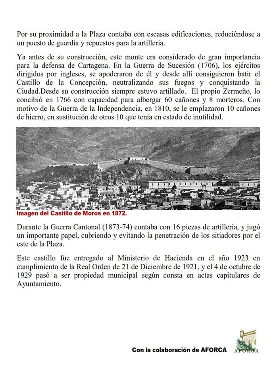 El domingo próximo tendrá lugar una visita guiada al Castillo de los Moros organizada por la asociación de Amigos Veteranos de los Castillos cartageneros, sus Fortalezas, Murallas, viejas Torres y Baterías (AFORCA) en colaboración con el Ayuntamiento de Cartagena, dentro de la actividades del Año de la Ilustración.