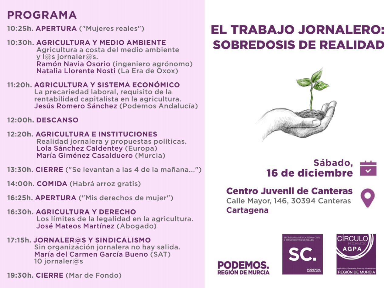Podemos Región de Murcia organiza las I Jornadas sobre el trabajo de los jornaleros del campo de la región de Murcia donde se debatirá y se expondrán las condiciones de precariedad y explotación laboral por las que atraviesan estos trabajadores.
