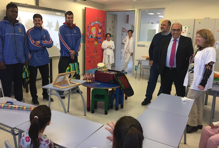 El hospital de Santa Lucía ha recibido hoy la visita de algunos integrantes del Club Básket de Cartagena, quienes han obsequiado con camisetas y peluches a los más pequeños ingresados, tanto en el aula hospitalaria como en las habitaciones en planta para aquellos que no han podido salir de ellas por criterio clínico.