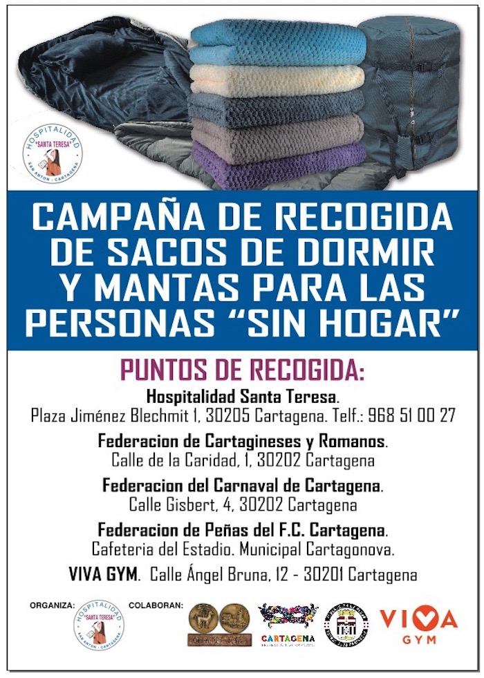Con ocasión de la ola de frío, en la Fundación Hospitalidad Santa Teresa ha organizado una campaña de recogida de sacos de dormir y mantas para repartir entre las personas ‘sin hogar’, con la colaboración de la Federación de Carnaval, Carthagineses y Romanos, Federación de Peñas del FC Cartagena y Vivagym.