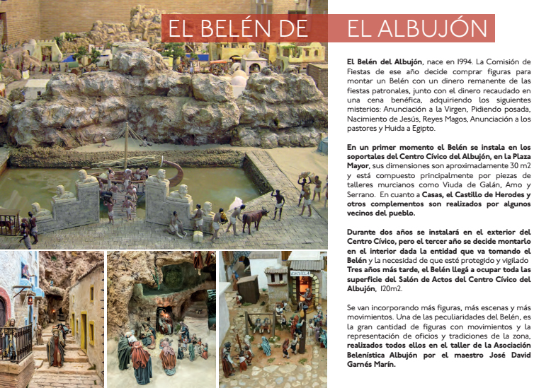 La representación del nacimiento de Jesucristo con mayor número de piezas de Cartagena se exhibe en El Albujón. Allí está uno de los belenes más grandes del municipio y con un mayor número de piezas, llegando casi a las 2.000. Su horario de visita es de 11 a 14 horas por la mañana y de 17 a 21 por la tarde, hasta el 7 de enero en el Centro Cívico.