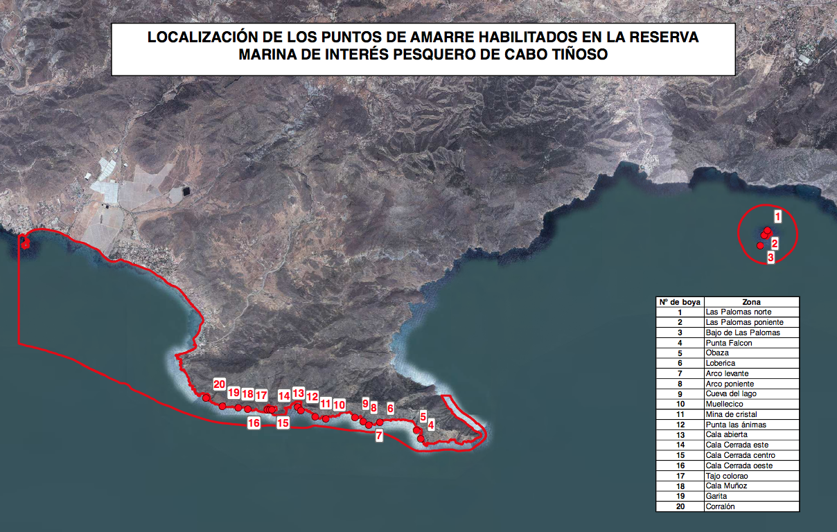Los puntos de amarre habilitados están ubicados en las zonas de Las Palomas (Norte, Poniente y Bajo), Punta Falcón, Obaza, Loberica, Arco Levante, Arco Poniente, Cueva del Lago, Muellecico, Mina de Cristal, Punta las ánimas, Cala abierta y Cala Cerrada (Este, Centro y Oeste). Los puntos elegidos han sido acordados con los centros de buceo que operan en la reserva. Próximamente la Consejería establecerá las normas que regulan su utilización.