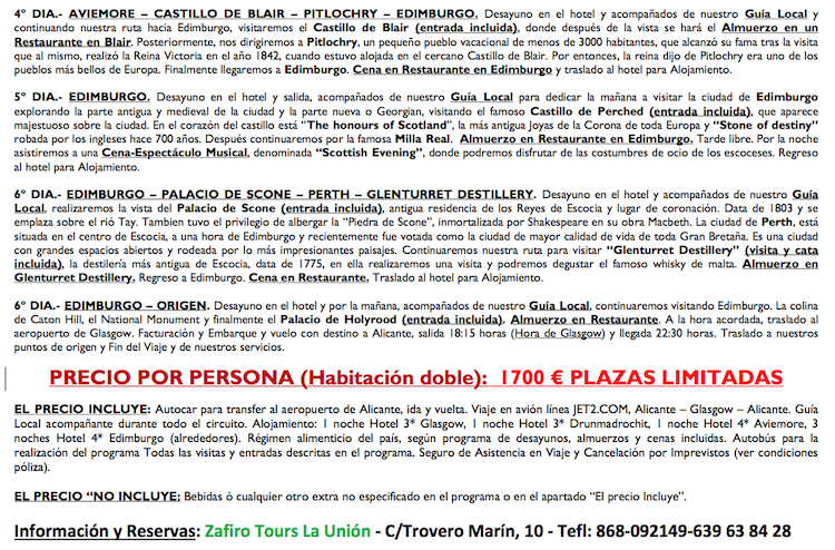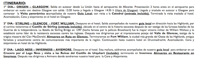 La agencia de viajes unionense ha preparado un muy atractivo viaje para este próximo verano por las tierras escocesas con visitas al Valle de Glencoe, Fort William, Castillo de Balir, Edimburgo, Palacio de Scone y Lago Ness, entre otros puntos de interés.