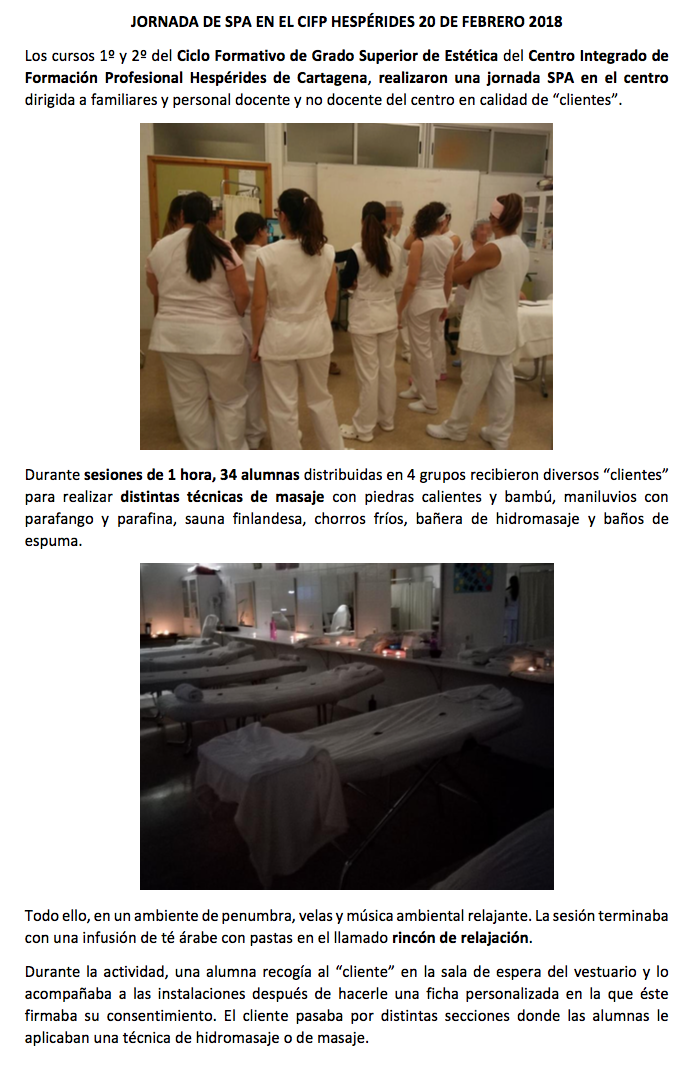 Los cursos 1º y 2º del Ciclo Formativo de Grado Superior de Estética del Centro Integrado de Formación Profesional Hespérides de Cartagena, realizaron una jornada SPA en el centro dirigida a familiares y personal docente y no docente del centro en calidad de “clientes”.