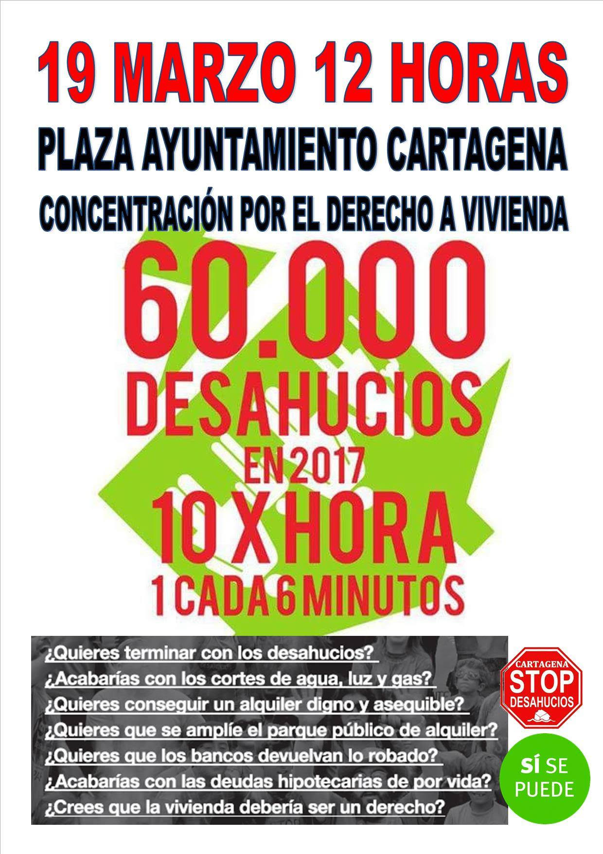 La Plataforma de afectadas por la hipoteca de Cartagena convoca una concentración el 19 de marzo a las 12h en la plaza del Ayuntamiento dentro de la campaña Apoyos a la #LeyViviendaPAH.