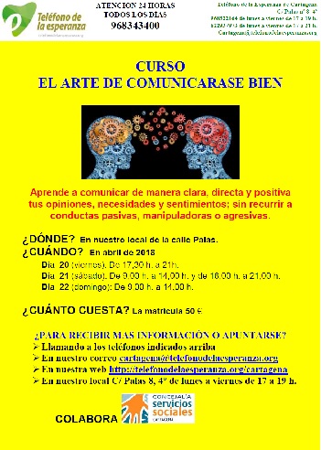 El Teléfono de la esperanza de Cartagena organiza el curso 'El arte de comunicarse bien', que se celebrará los días 20, 21 y 22 de abril en su local de la calle Palas nº8, 4º piso. El objetivo del curso es enseñar a los participantes métodos para aprender a comunicar de manera clara, directa y positiva las opiniones propias, necesidades y sentimientos. Tambien identificar las conductas pasivas, manipuladoras y agresivas y así evitarlas.