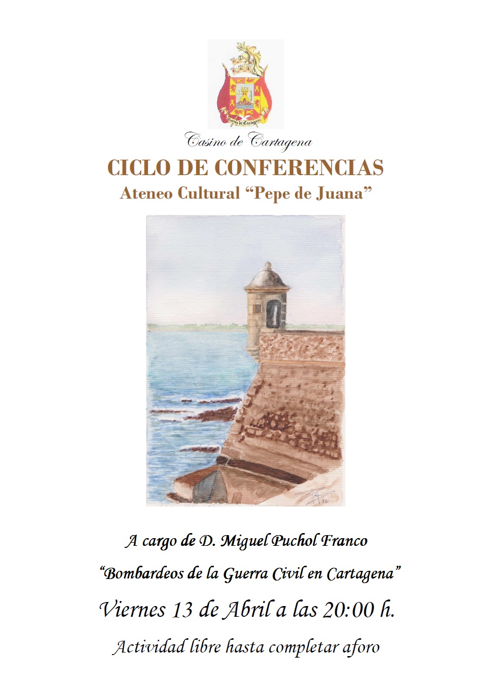 El Casino de Cartagena acogerá el próximo viernes 13 de abril a las 20:00 horas la charla 'Bombardeos de la Guerra Civil en Cartagena' a cargo de Miguel Puchol Franco. Se trata de una nueva actividad que se enmarca dentro del ciclo de conferencias Ateneo Cultural 'Pepe de Juana'.