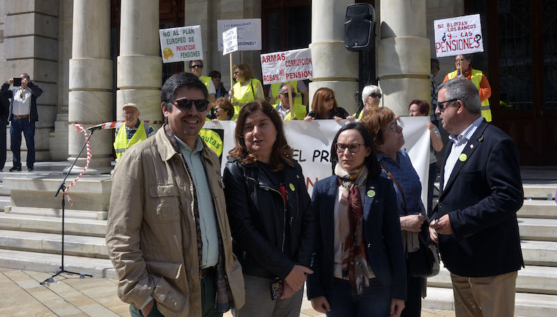 Más de trescientas personas han acudido hoy a la plaza del Ayuntamiento para elevar nuevamente la voz contra la ridículas subidas de las pensiones de los últimos años y para oponerse al producto europeo de pensiones individuales (PEPP) que está haciendo llegar el Gobierno de la Nación, “porque es un producto financiero ajeno al sistema público de pensiones”.