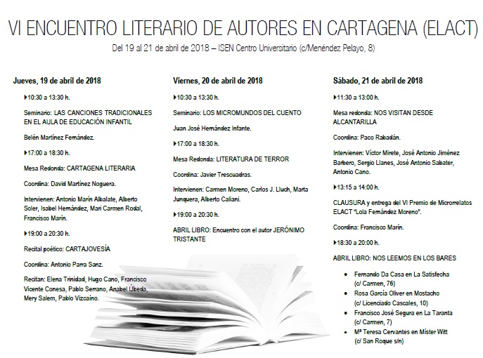Con el día del libro en el horizonte, el VI Encuentro Literario de Autores en Cartagena vuelve un año más a ofrecer al público un ramillete de actividades literarias de lo más variado, desde el análisis de las distintas actividades del ramo que se realizan en la ciudad hasta el género de terror, pasando por la eclosión de un buen grupo de jóvenes poetas. Este año los actos se celebran entre los días 19 y 21 de abril.