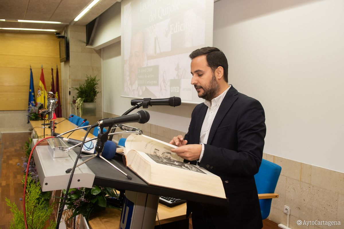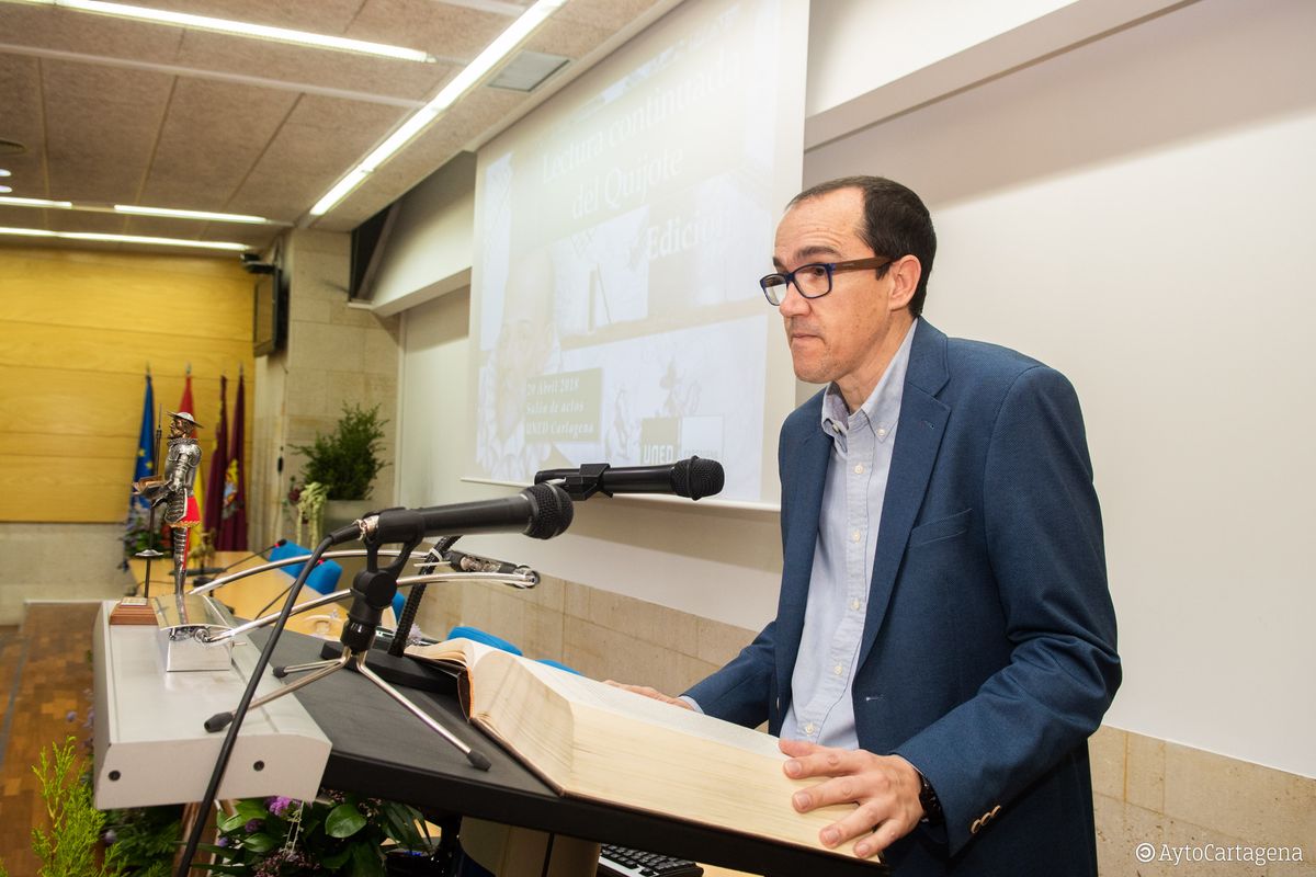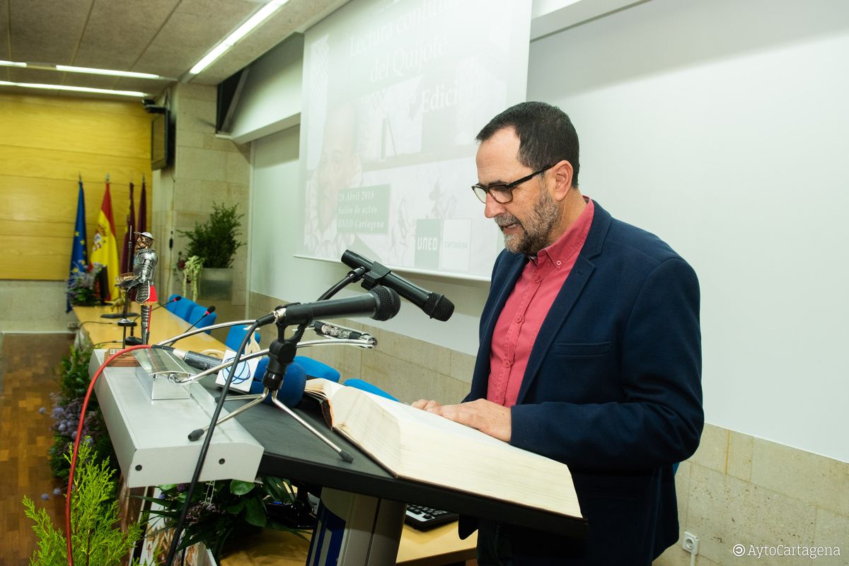 El Salón de Actos de la UNED en Cartagena ha sido el escenario por quinto año consecutivo de la lectura continuada de Don Quijote de la Macha. Este año se ha leído desde el capítulo 54 hasta el final de la obra, cuando Don Quijote, ya cuerdo, muere.