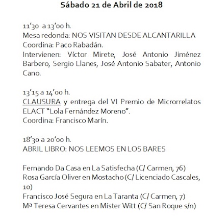 El encuentro con el autor será a las 19 horas y se centrará sobre su libro 'Nunca es tarde'. La clausura, en la mañana del sábado, contará con la entrega de premios del VI Concurso de Microrrelatos ELACT “Lola Fernández Moreno”, que este año ha superado los mil trabajos presentados. Más información en Facebook: pinchar aquí