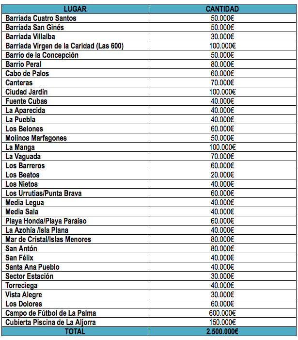 Ortega ha querido resaltar que “mantenemos el compromiso con los vecinos de La Palma y La Aljorra, proponiendo 750.000 € para la construcción del campo de fútbol en La Palma y el arreglo de la cubierta de la piscina de La Aljorra. Por otro lado el portavoz adjunto ha añadido que “en ningún momento hemos suprimido las inversiones que estaban incluidas en los presupuestos participativos. Lo que hacemos es proponer que el dinero del superávit vaya a donde los presupuestos participativos no  llegan y los presupuestos participativos se financien en los presupuestos municipales, tal y como el Gobierno aprobó en Junta de Gobierno en su propuesta de Presupuestos Municipales donde hay más de 3.4 millones de euros destinados a este programa. ”
