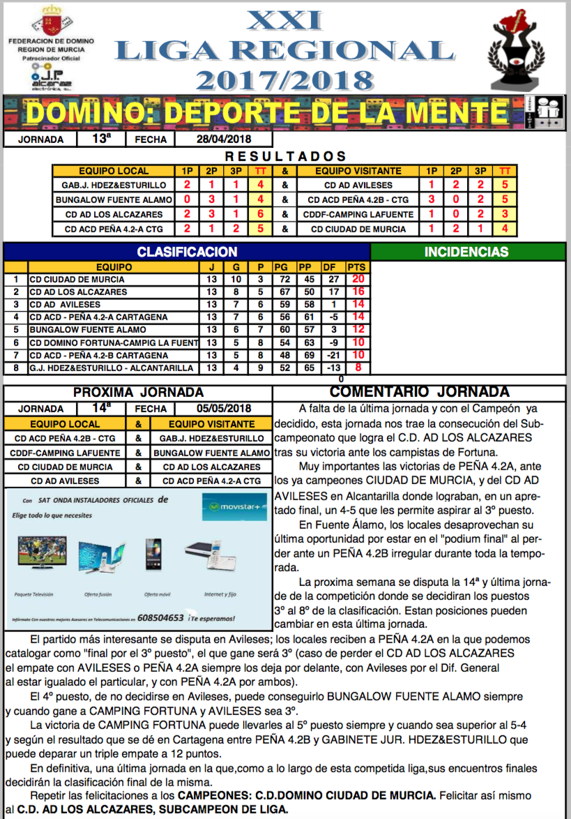 Los equipos A y B de la ACD Peña 4.2 han saldado con victorias sus compromisos de la décimo tercera jornada de la XXI Liga Regional de dominó al vencer, respectivamente, al Ciudad de Murcia y Fuente Álamo.