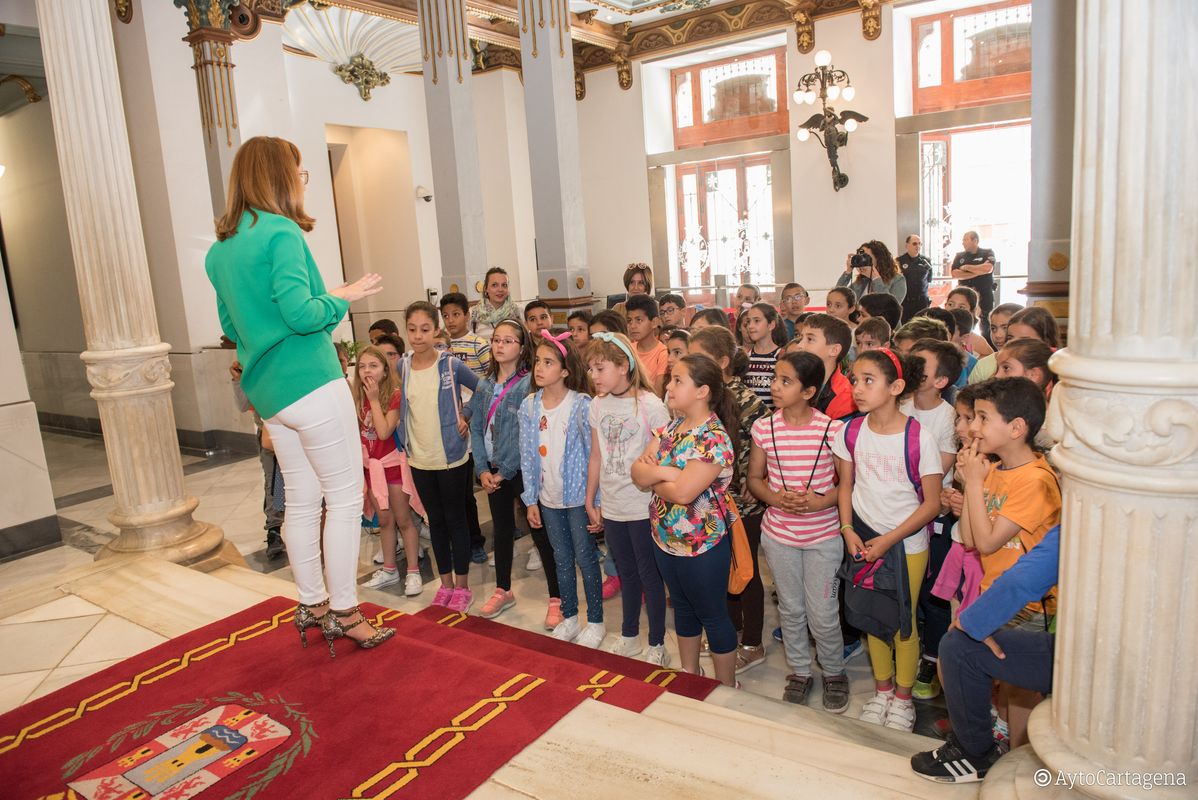 Sesenta alumnos del colegio publico San Fulgencio de Pozo Estrecho han visitado este martes el Palacio Consistorial. Las tres clases de tercero de primaria han sido recibidas por la alcaldesa de Cartagena, Ana Belén Castejón.