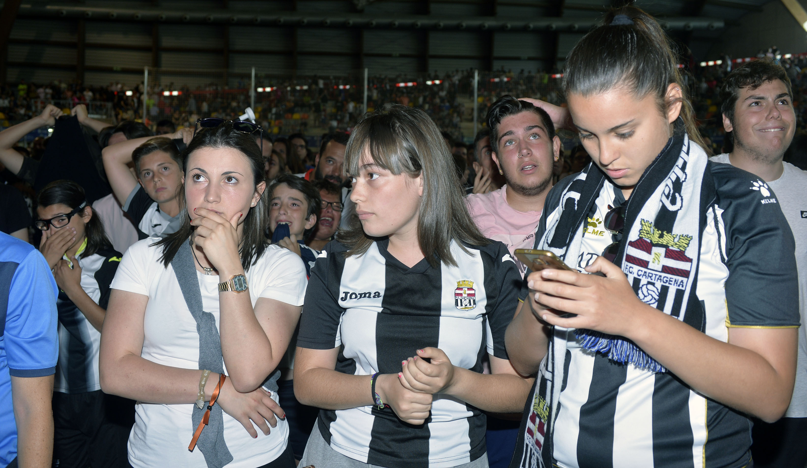 Decepción entre los seguidores del FC Cartagena tras la derrota en Majadahonda donde encajaron un gol en propia puerta casi en el minuto 97 ante un Rayo que no remató ni una vez contra la meta albinegra. El Palacio de Deportes de Cartagena acogió a tres mil quinientos seguidores que siguiendo el encuentro a través de una gran pantalla. El ascenso al fútbol profesional ya se celebraba… y llegó el mazazo. Cruel fútbol.