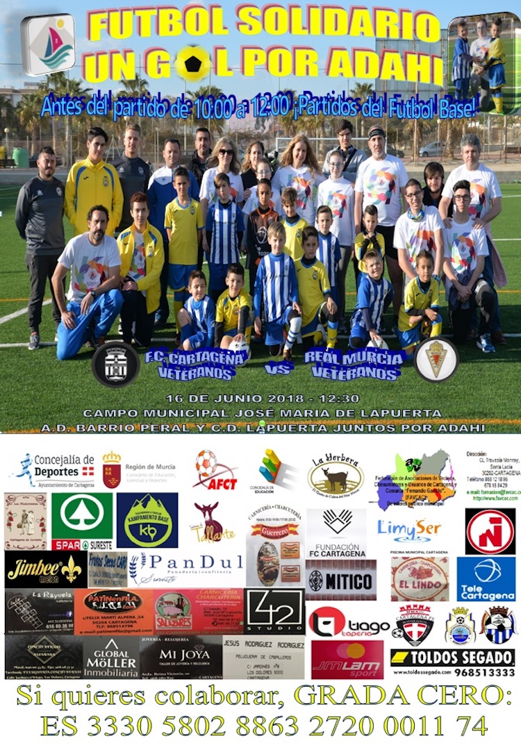 El sábado 16 de junio será una jornada en la que el fútbol mostrará su cara más solidaria con la disputa de diversos partidos en el campo municipal de José María Lapuerta para ayudar a la Asociación de Auyuda al Déficit de Atención con más o menos Hiperactividad (Adahi). De 10 a 12 horas se celebrarán partidos de fútbol base y a las 12.30 horas se enfrentarán los veteranos del Cartagena FC y del Real Murcia.