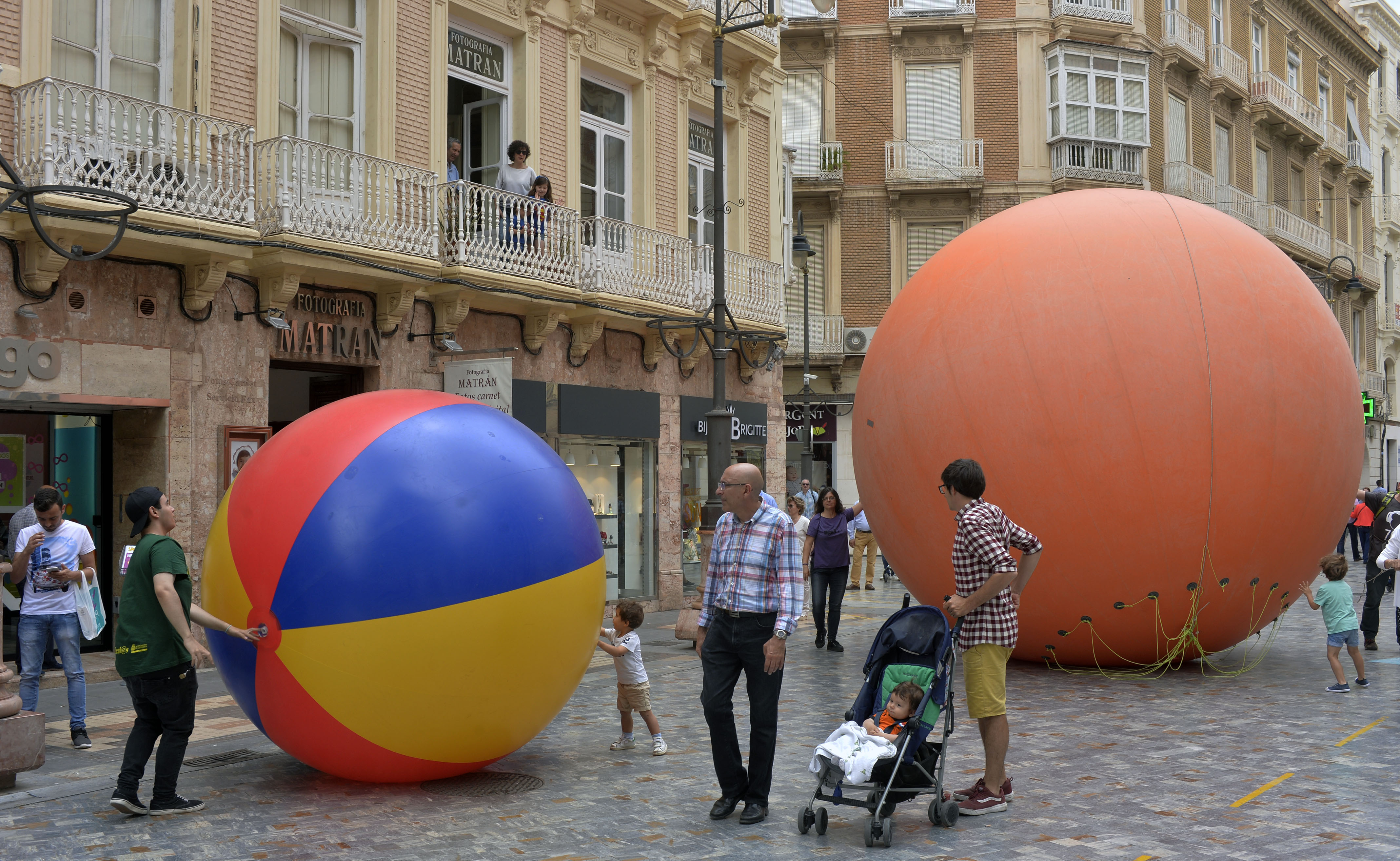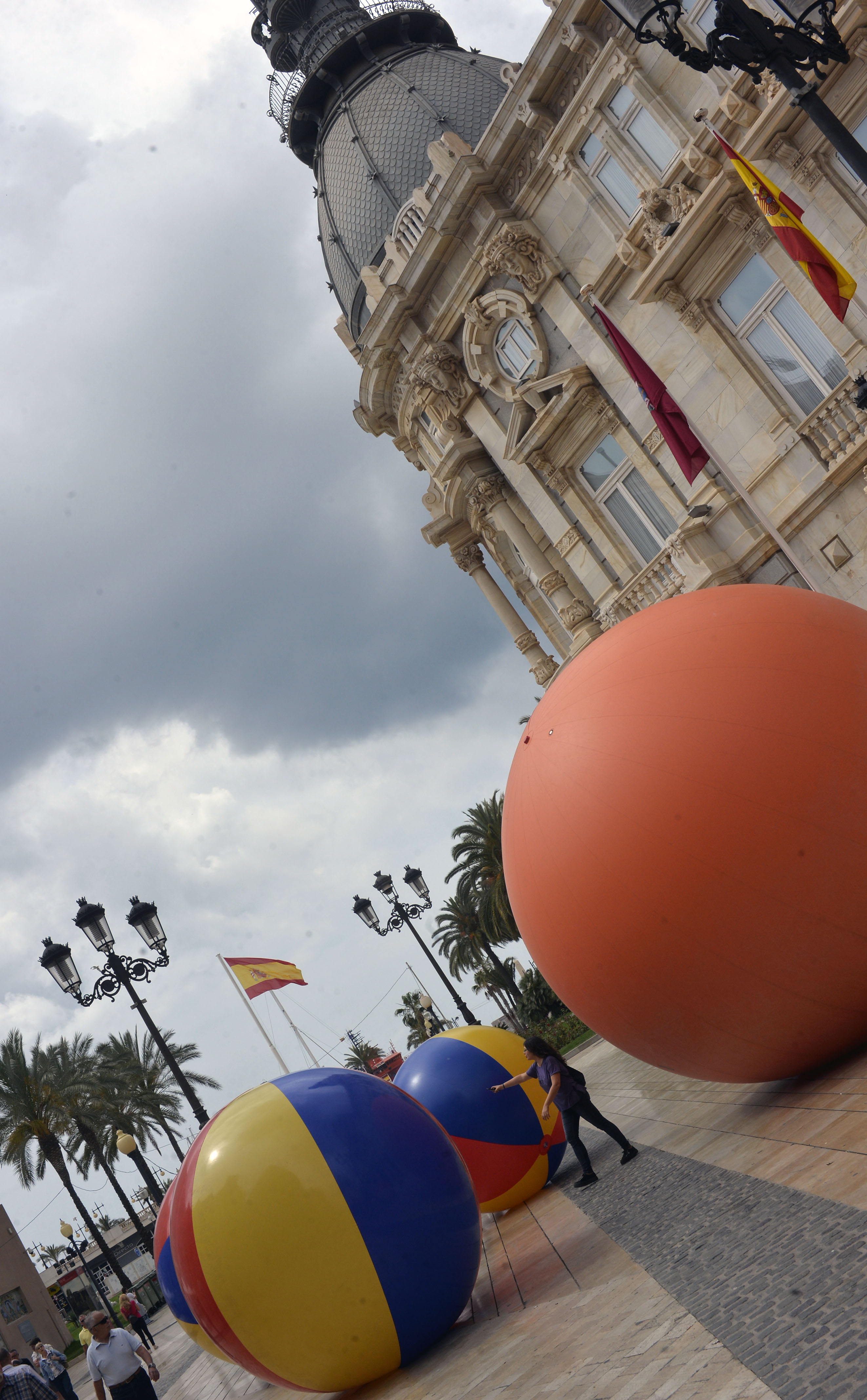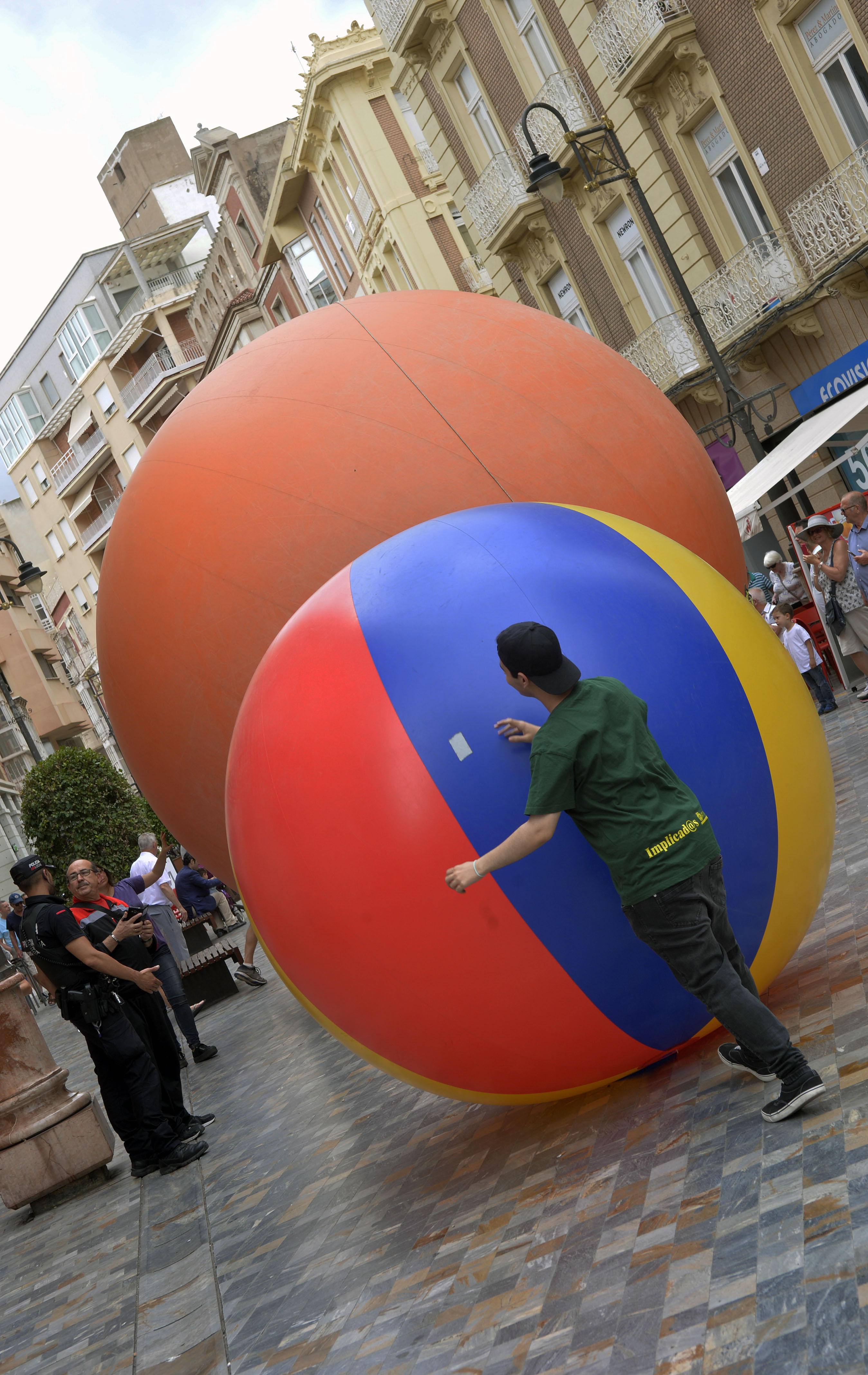 Cinco pelotas de playa gigantes invaden el centro de la ciudad por las calles y avenidas. Por donde circula el ruido, el humo, la contaminación, circulan personas con pelotas enormes que invitan a la sonrisa,el divertimento, la alegría y la ilusión.