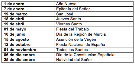 Así, las fiestas laborales en todo el ámbito territorial de la Región para 2018 serán, además de todos los domingos, las siguientes: Martes 1 de enero, Año Nuevo; lunes 7 de enero, lunes posterior a la Epifanía del Señor; lunes 19 de marzo, San José; jueves 18 de abril, Jueves Santo; viernes 19 de abril, Viernes Santo; miércoles 1 de mayo, Fiesta del Trabajo; lunes 10 de junio, fecha posterior al Día de la Región de Murcia; jueves 15 agosto, Asunción de la Virgen; sábado 12 de octubre, Fiesta Nacional de España; viernes 1 de noviembre, Todos los Santos; viernes 6 de diciembre, Día de la Constitución Española, y miércoles 25 de diciembre, Natividad del Señor.