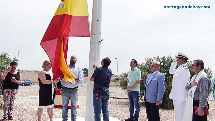 El siguiente capítulo ha sido el acto de izar por los diez metros de altitud del mástil (procedente de un barco) la enseña, labor que ha correspondido a Manuel Vallés, vecino de La Aljorra; Chenchi Nicolás, de la asociación vecinal, y David Martín, presidente de la asociación de vecinos de La Palma y que ha acudido como vocal de Infraestructuras de la Federación de Asociaciones de Vecinos. El izado ha estado acompañado por los sones del himno nacional.