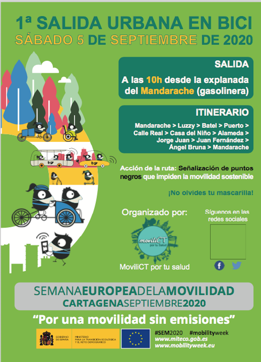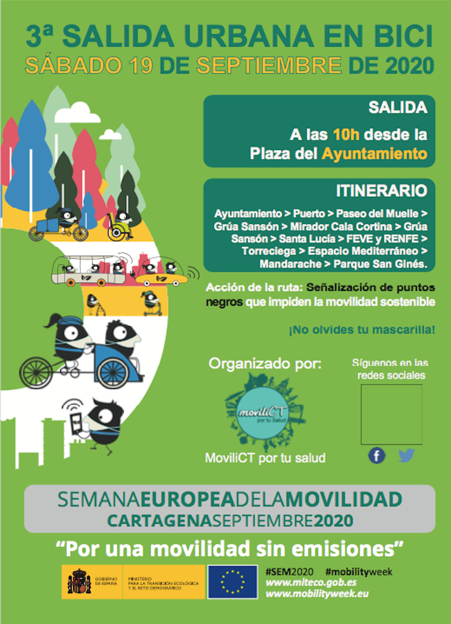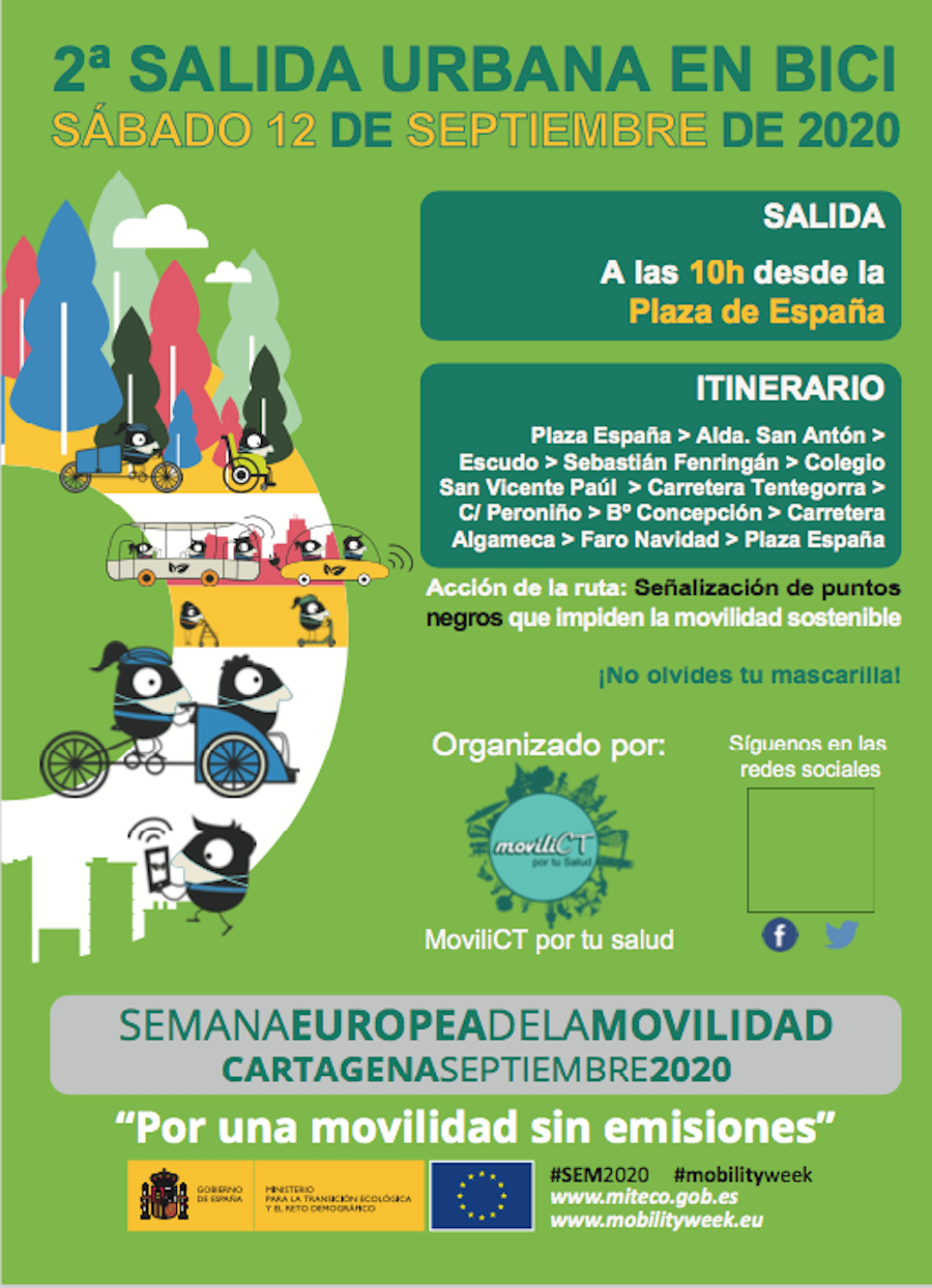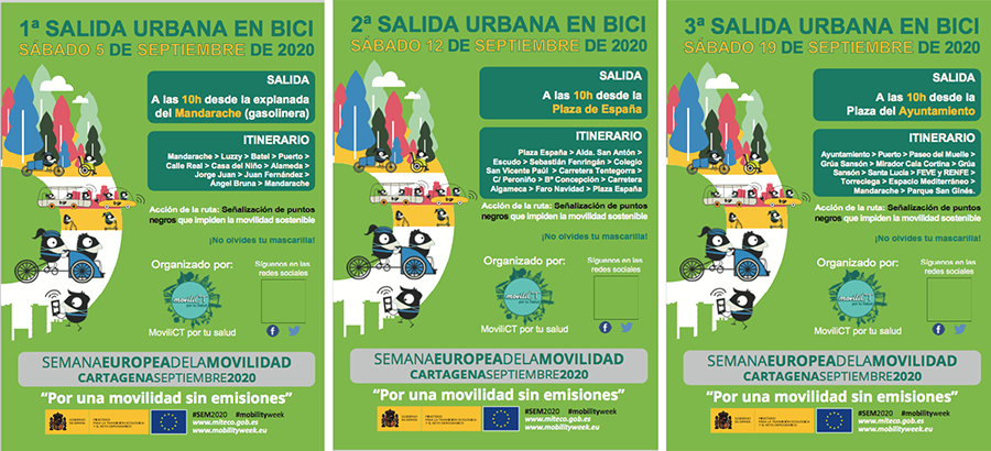 Parar poner el foco en muchas de las necesidades y carencias de la movilidad sostenible en nuestra ciudad, desde MoviliCT se propone la realización de tres rutas diferentes a realizar durante la SEM 2020, en los tres primeros sábados de septiembre (5, 12 y 19). Cada ruta tendrá un itinerario diferente, partiendo siempre desde el centro de Cartagena. A lo largo de la ruta, todos los participantes realizarán paradas para señalizar y marcar los distintos puntos negros de la misma, no sólo para los ciclistas, también para las personas que pasean y para aquellas que tienen movilidad reducida.