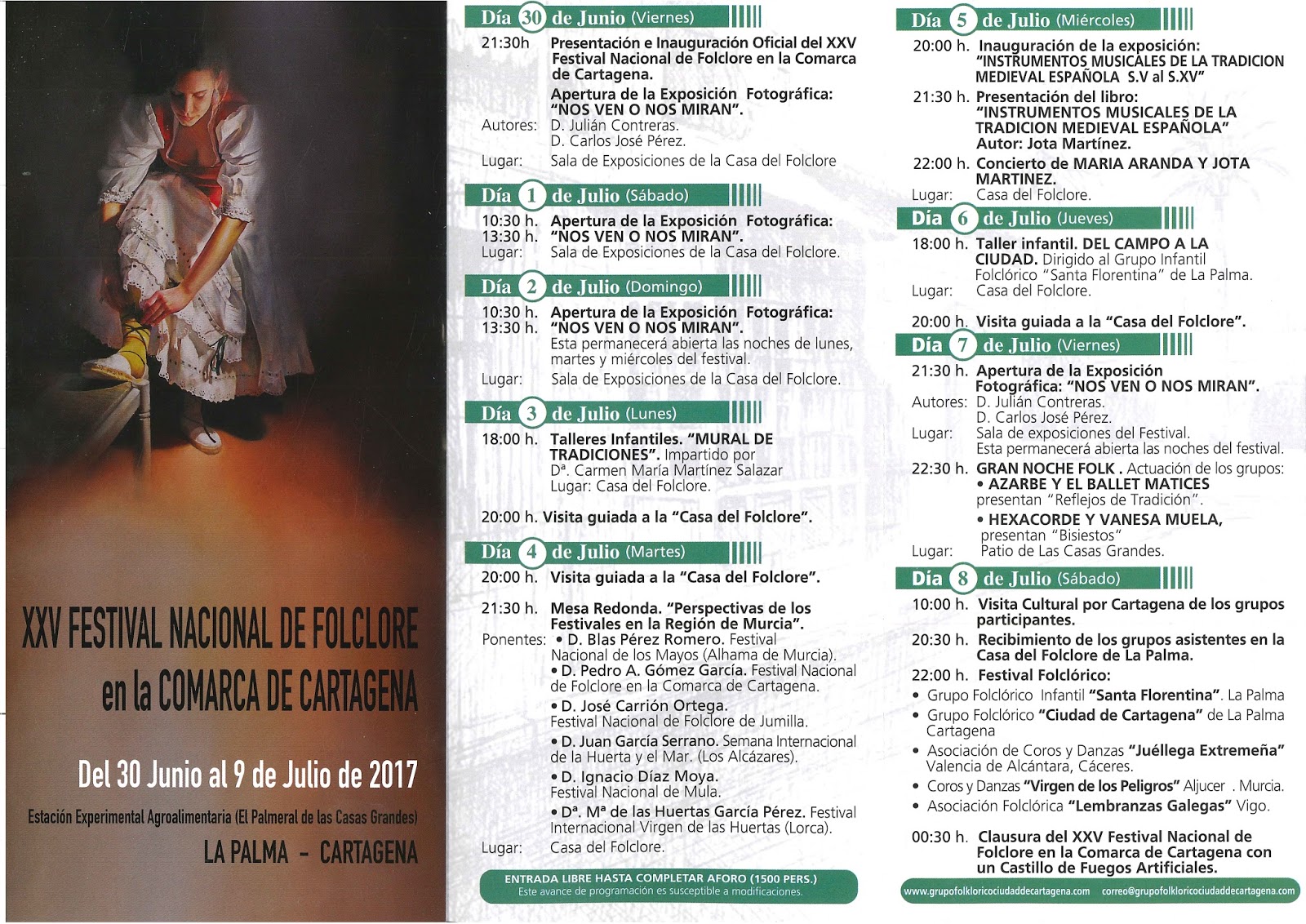 La puesta de largo será este viernes alas 21.30 horas con la inauguración del XXV Festival y la apertura de la exposición fotográfica ‘Nos ven o nos miran’, de Julián Contreras y Carlos José Perez, en la sala de exposiciones de la Casa del Folclore, marco de las actividades, como talleres, visitas, presentación de un libro, un concierto y una mesa redonda, hasta el día 7, primer viernes de julio, cuando el epicentro se traslade al incomparable Patio de las Casas Grandes. Primero, ese día, con la Gran Noche Folk, en la que actuarán Azarbe y el ballet Matices y Hexacorde y Vanesa Muela, mientras que el sábado pasarán por el escenario el grupo infantil Santa Florentina y el grupo Ciudad de Cartagena, ambos de La Palma, junto a la asociación de coros y danzas ‘Juéllega extremña’, de Valencia de Alcántara (Cáceres); coros y danzas ‘Virgen de los Peligros’, de Aljucer (Murcia); y la asociación folclórica ‘Lembranzas Galegas’, de Vigo.